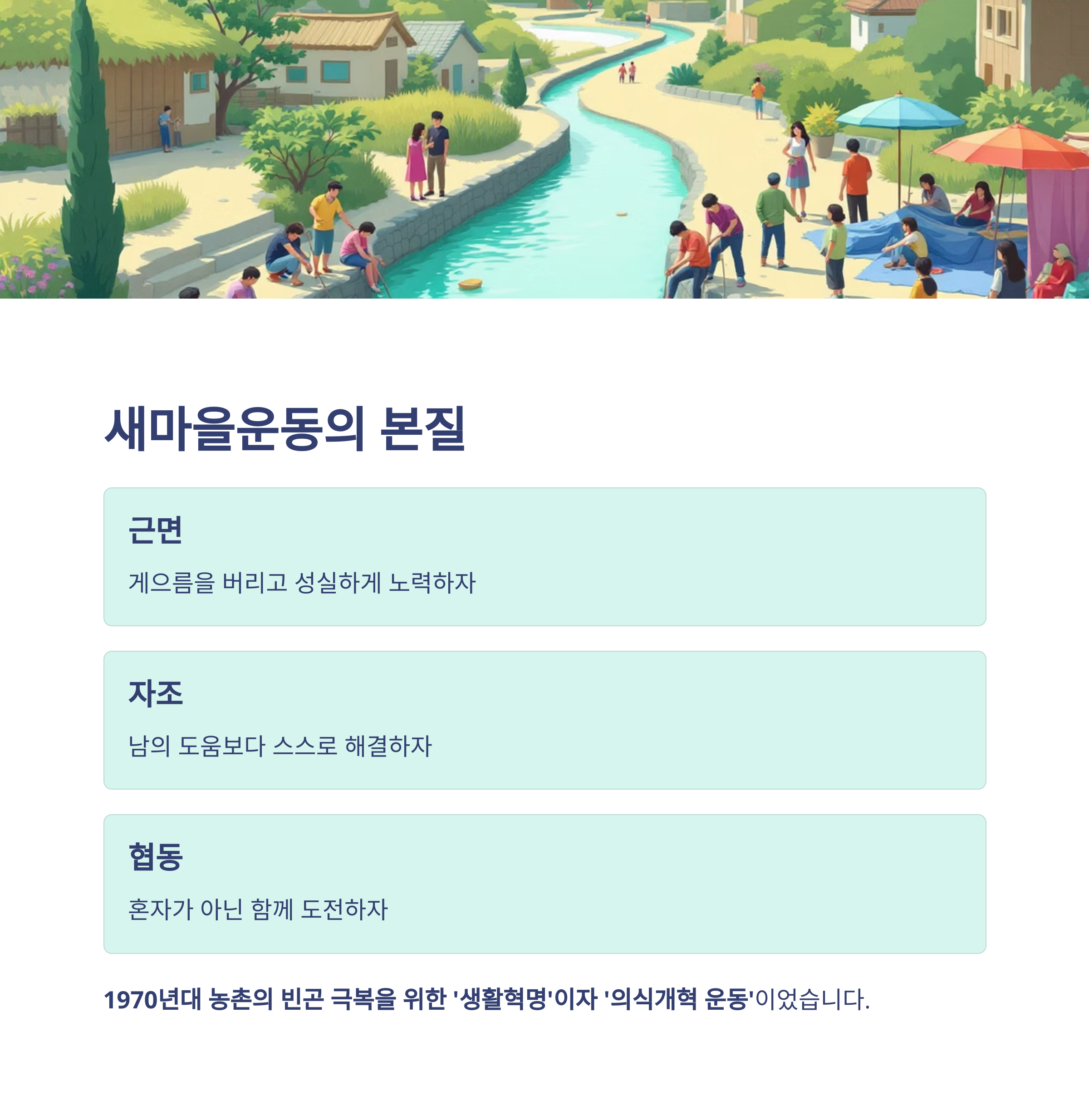 이 세 가지는 당시 농촌 발전뿐 아니라, 오늘날에도 적용 가능한 보편적 가치입니다.