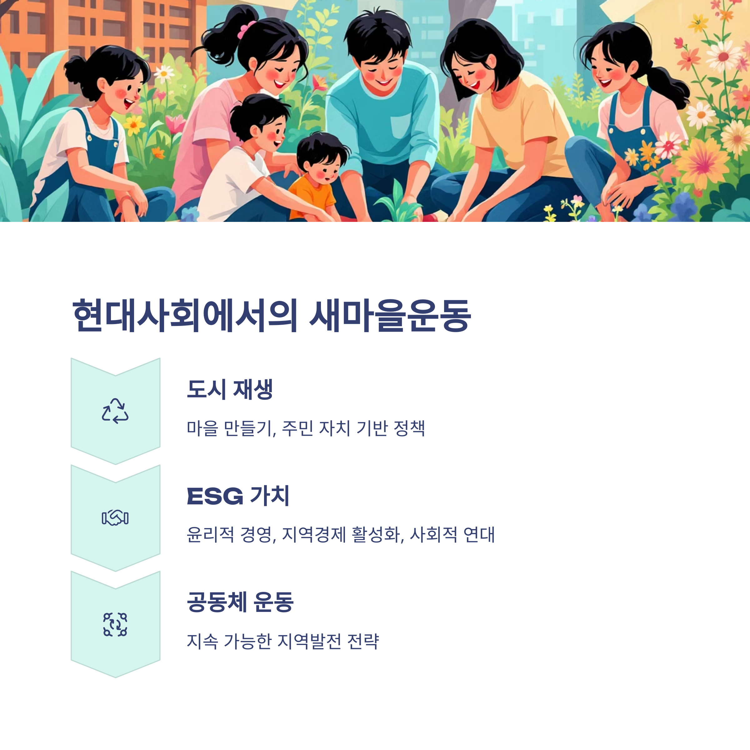 현대 사회에서는 새마을운동의 핵심 가치를 도시 재생, 마을 만들기, 주민 자치 기반의 정책으로 확대하고 있습니다.
