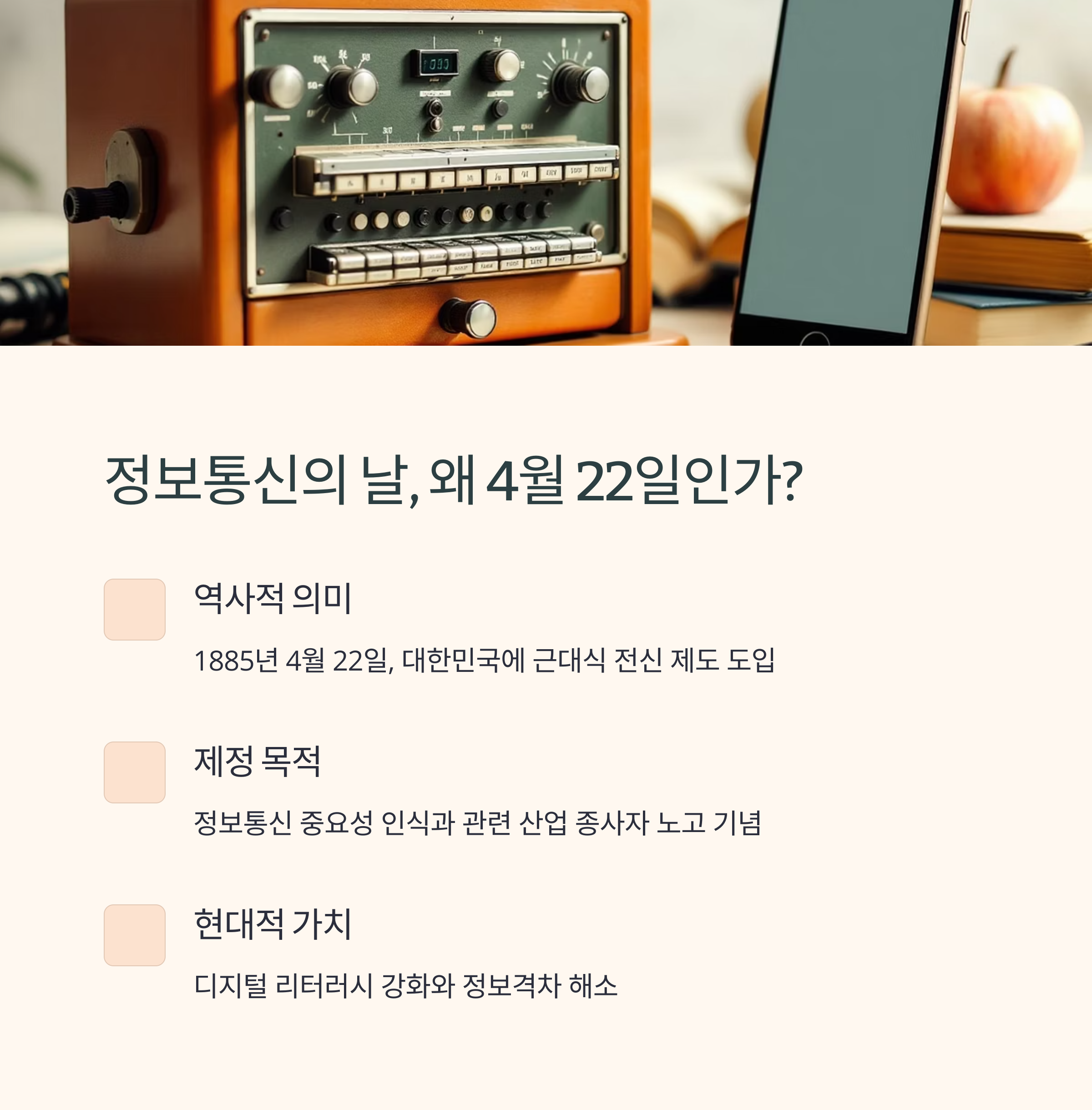 이날은 1885년 4월 22일, 대한민국에 근대식 전신(電信) 제도가 도입된 날을 기념하여 만들어졌습니다.
