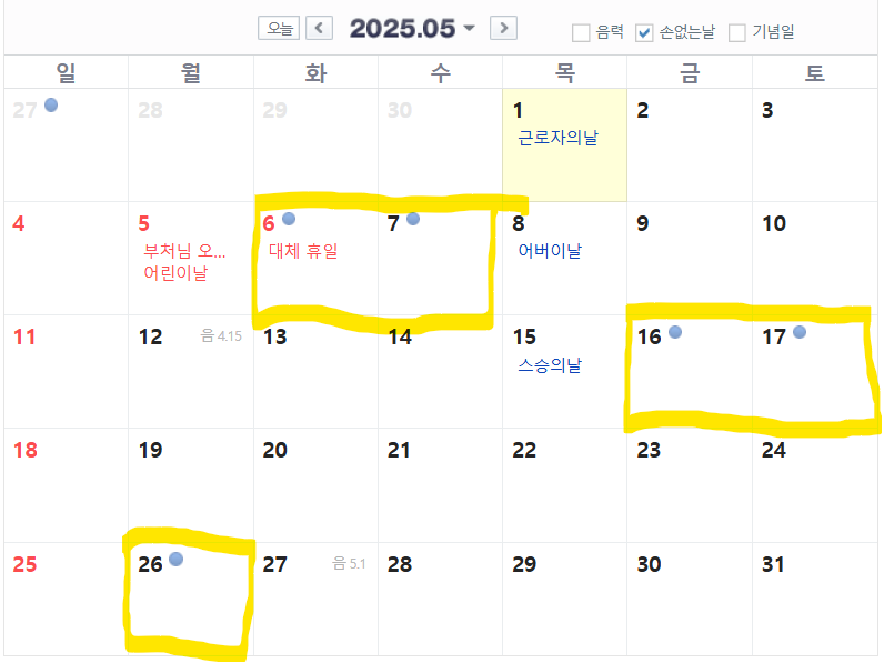 2025년 5월의 손 없는 날은 다음과 같습니다: