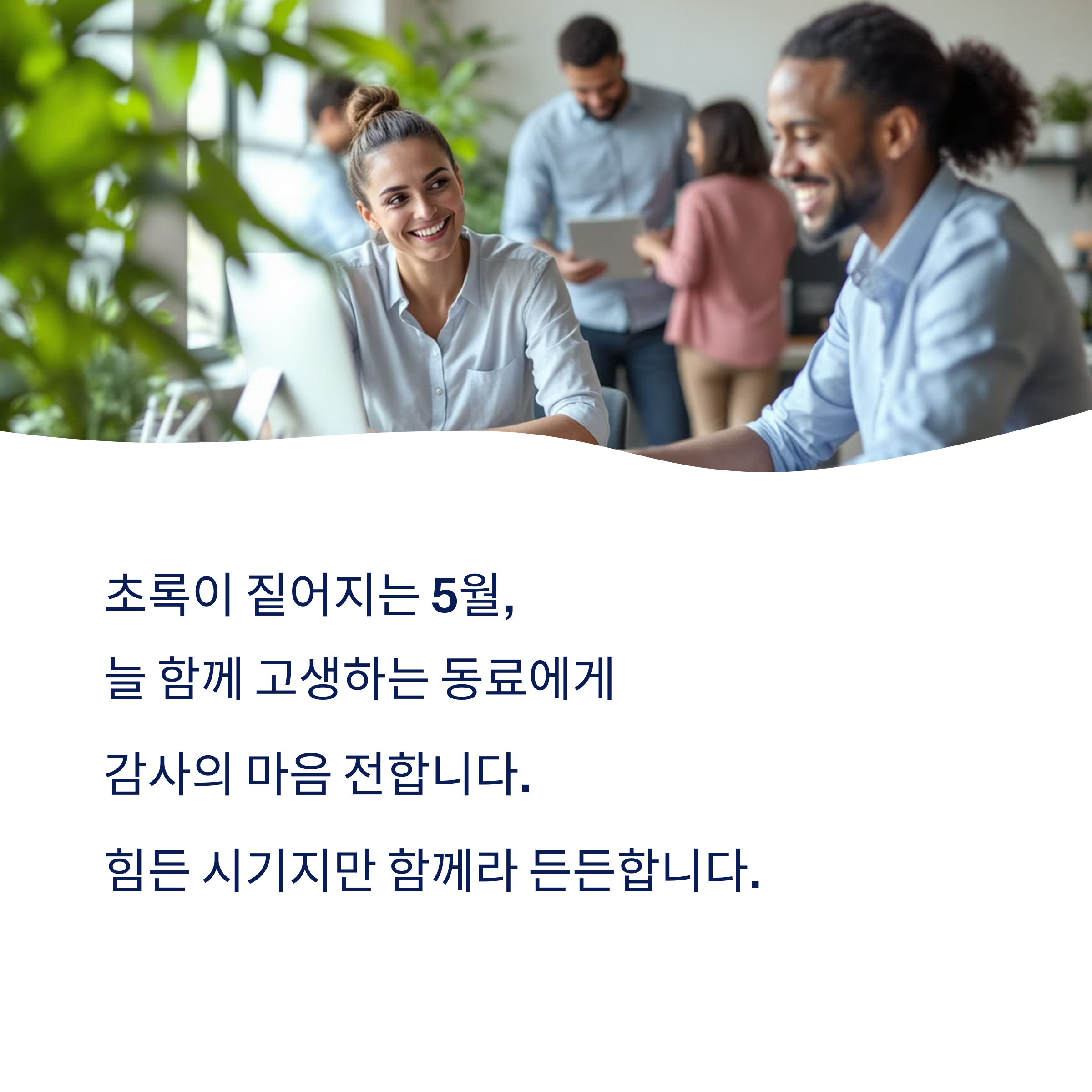 • "초록이 짙어지는 5월, 늘 함께 고생하는 동료에게 감사의 마음 전합니다. 힘든 시기지만 함께라 든든합니다."