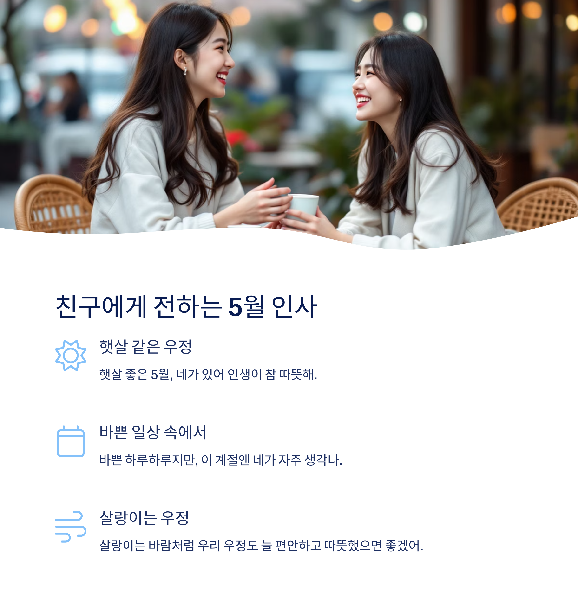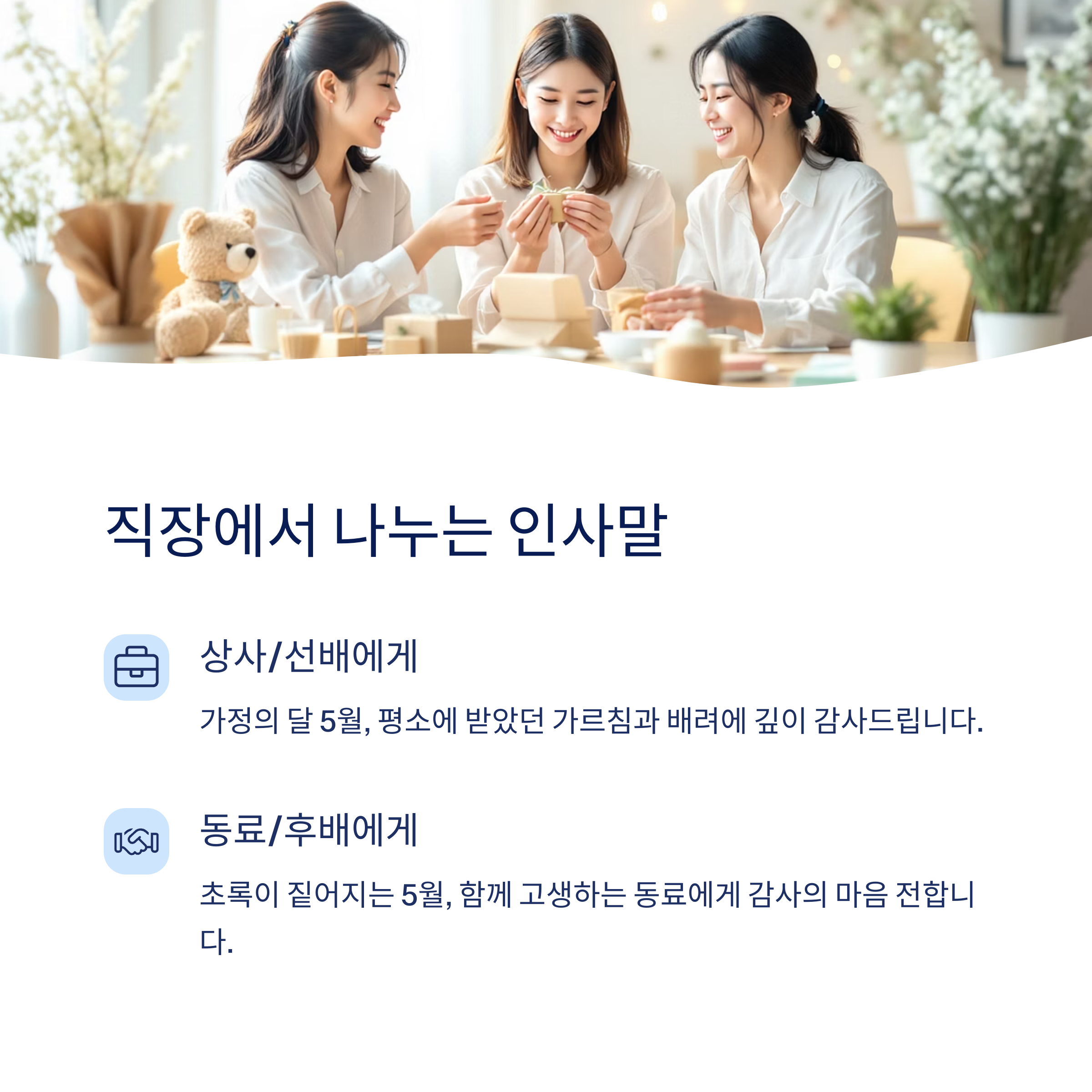 이번 5월, 당신의 진심을 담은 인사말로 주변 사람들에게 따뜻한 기억을 선물해보세요.