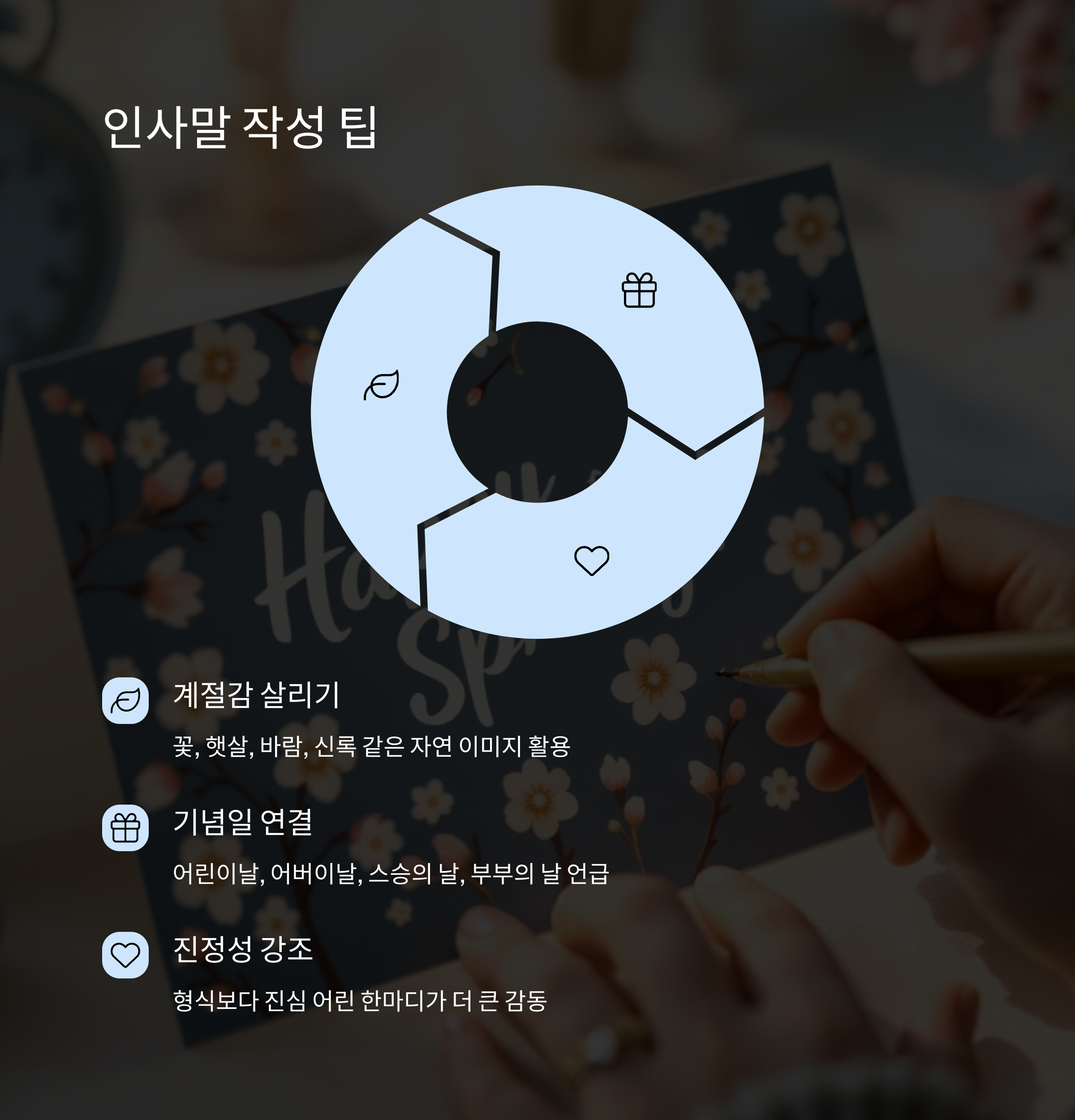 어린이날, 어버이날, 스승의 날, 부부의 날 등 주요 기념일을 함께 언급하면 더욱 의미 있는 메시지가 됩니다.