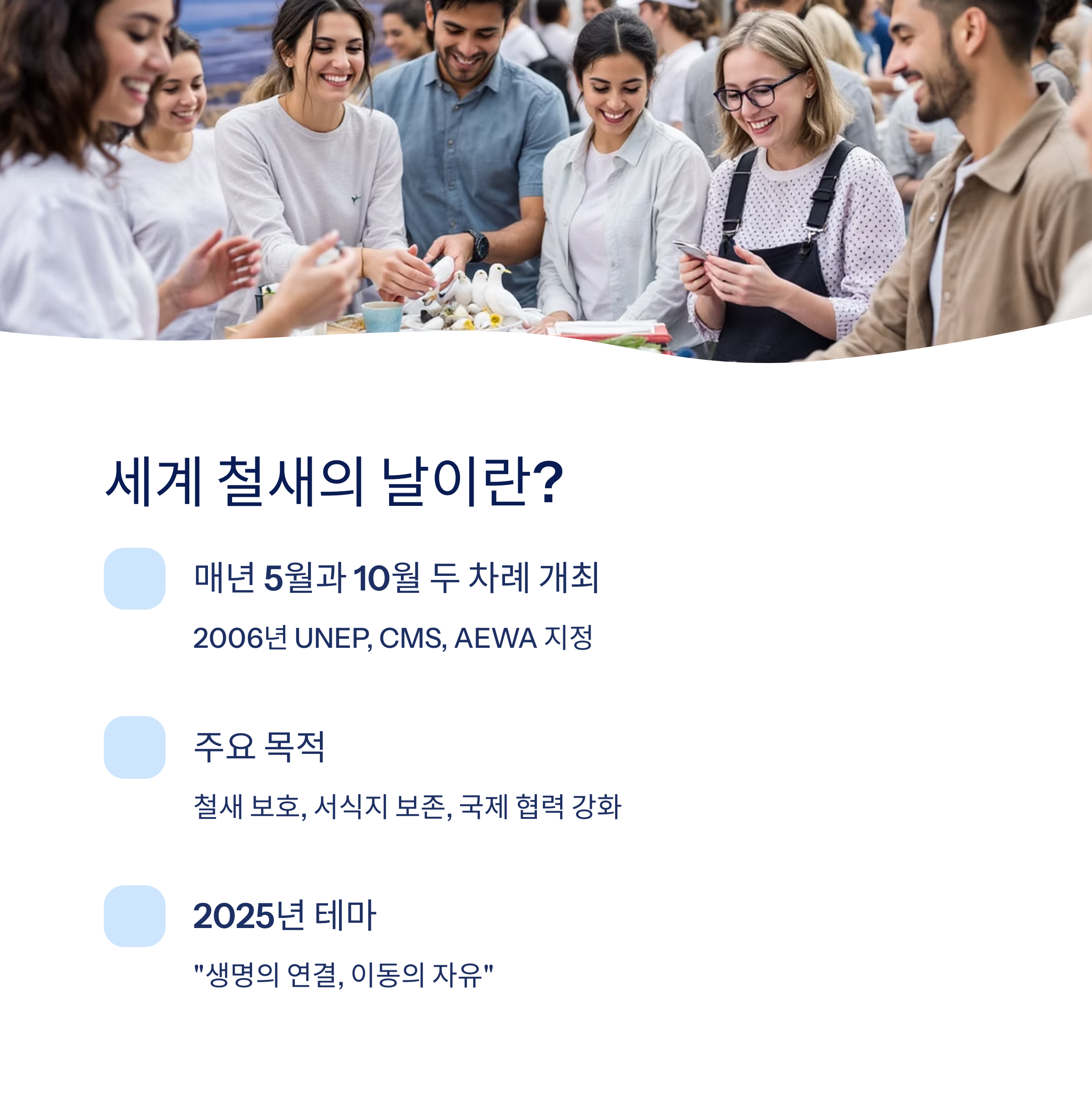 2025년 세계 철새의 날의 테마는 **“생명의 연결, 이동의 자유(Migratory Birds Connect the Planet)”**로, 철새가 단순한 새가 아닌 생태계의 중추라는 사실을 상기시키고 있습니다.