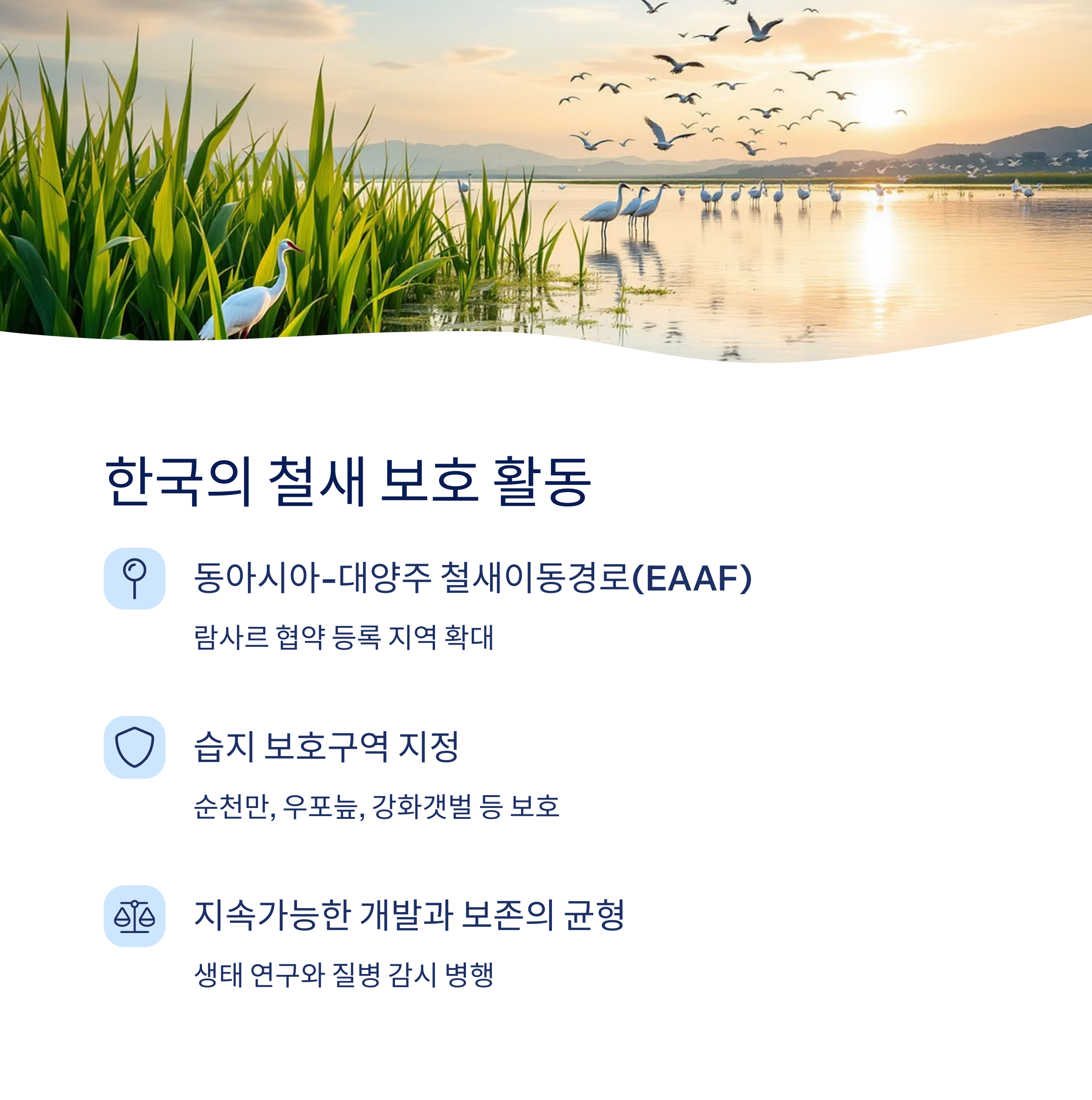한국은 순천만, 우포늪, 서천 갯벌 등 주요 철새 서식지를 람사르 습지로 지정하고 있으며, 다양한 보호구역을 설정해 생태계 보전을 추진하고 있습니다.