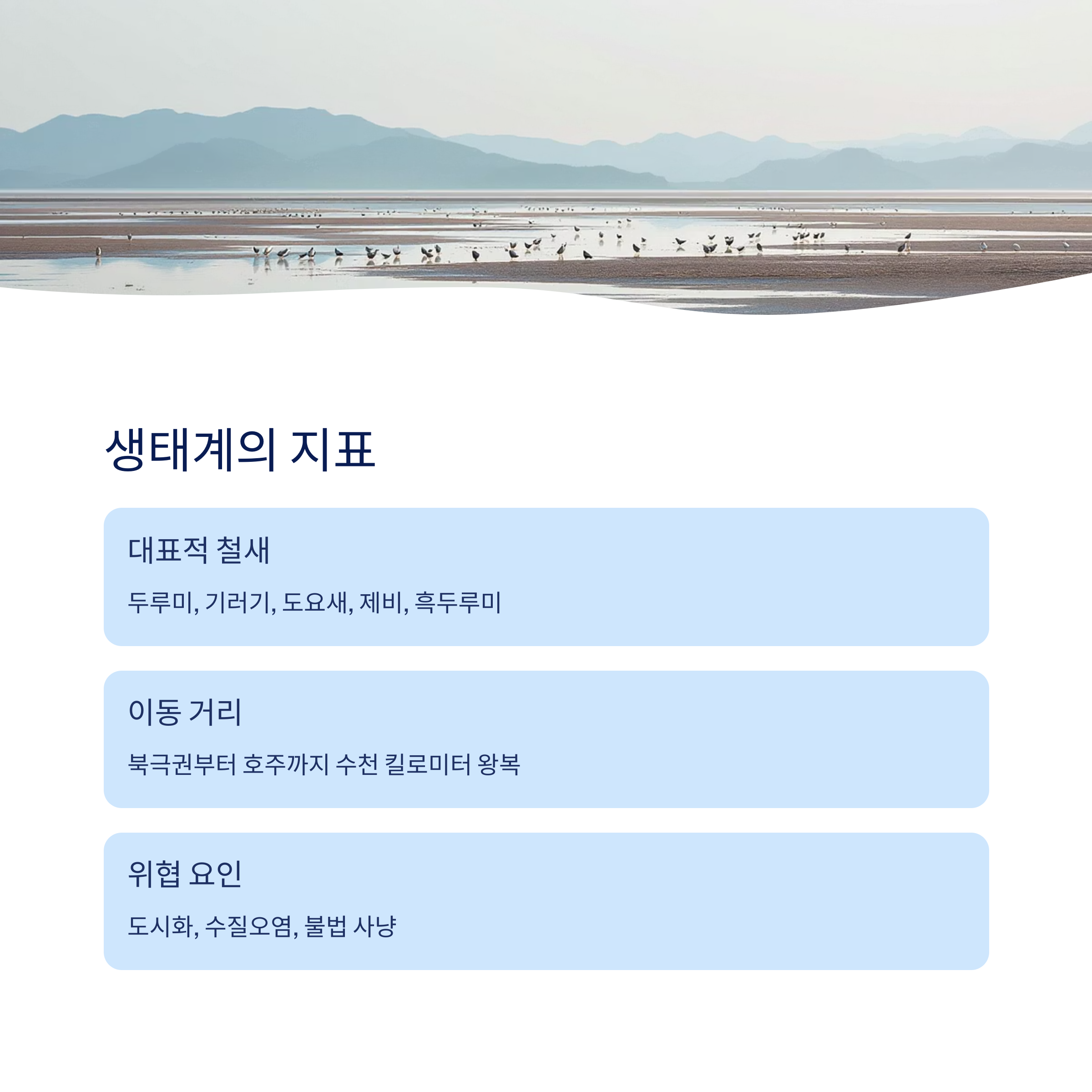예를 들어, 한국 서해안의 **갯벌(람사르 습지)**은 극동 러시아에서 호주까지 이동하는 철새들의 핵심 중간기착지입니다. 그러나 최근 갯벌 매립과 산업단지 개발로 철새의 생존이 위협받고 있습니다.