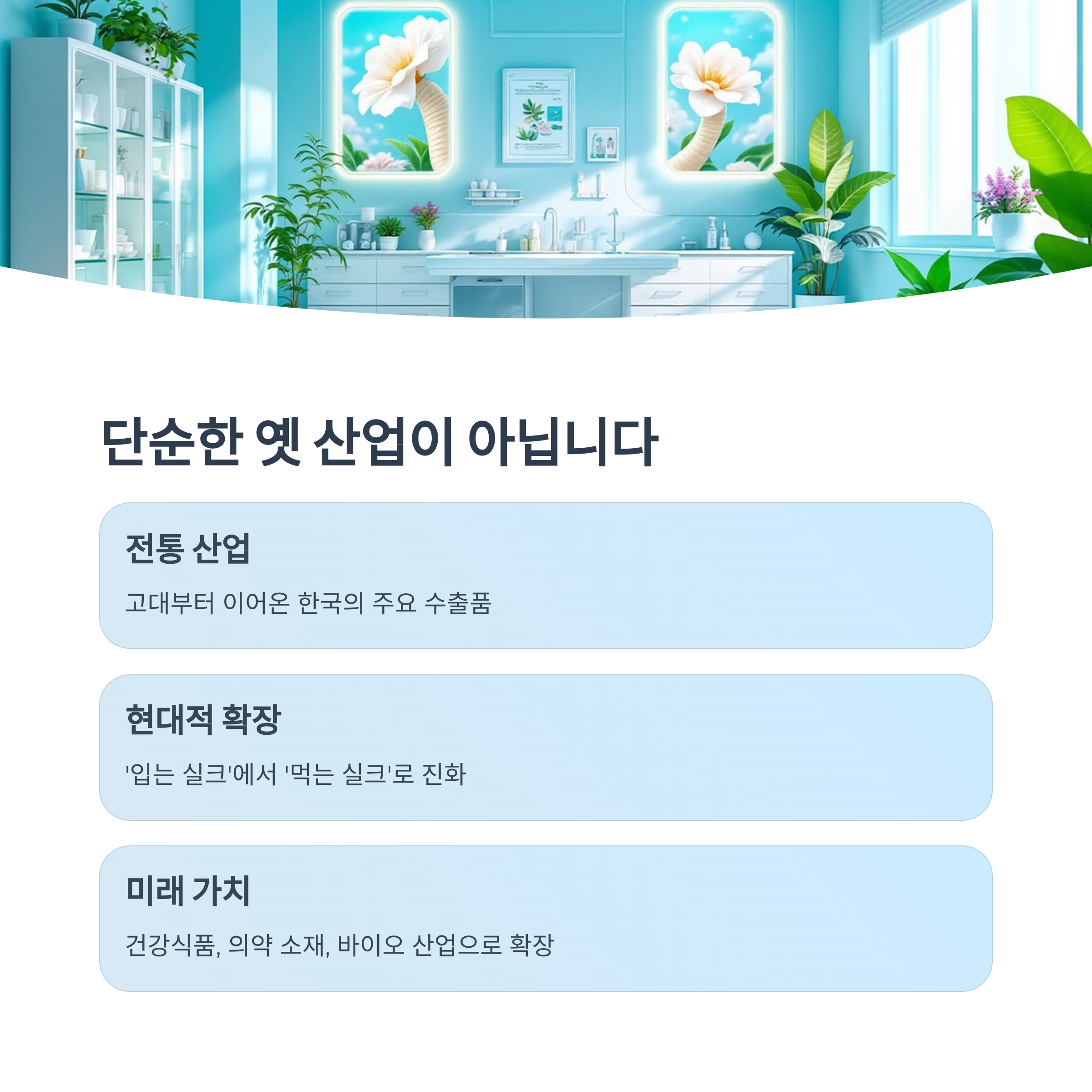 실크뿐 아니라 건강기능식품, 바이오소재 등으로 산업이 확대되고 있어 미래 유망 산업으로 주목받고 있습니다.