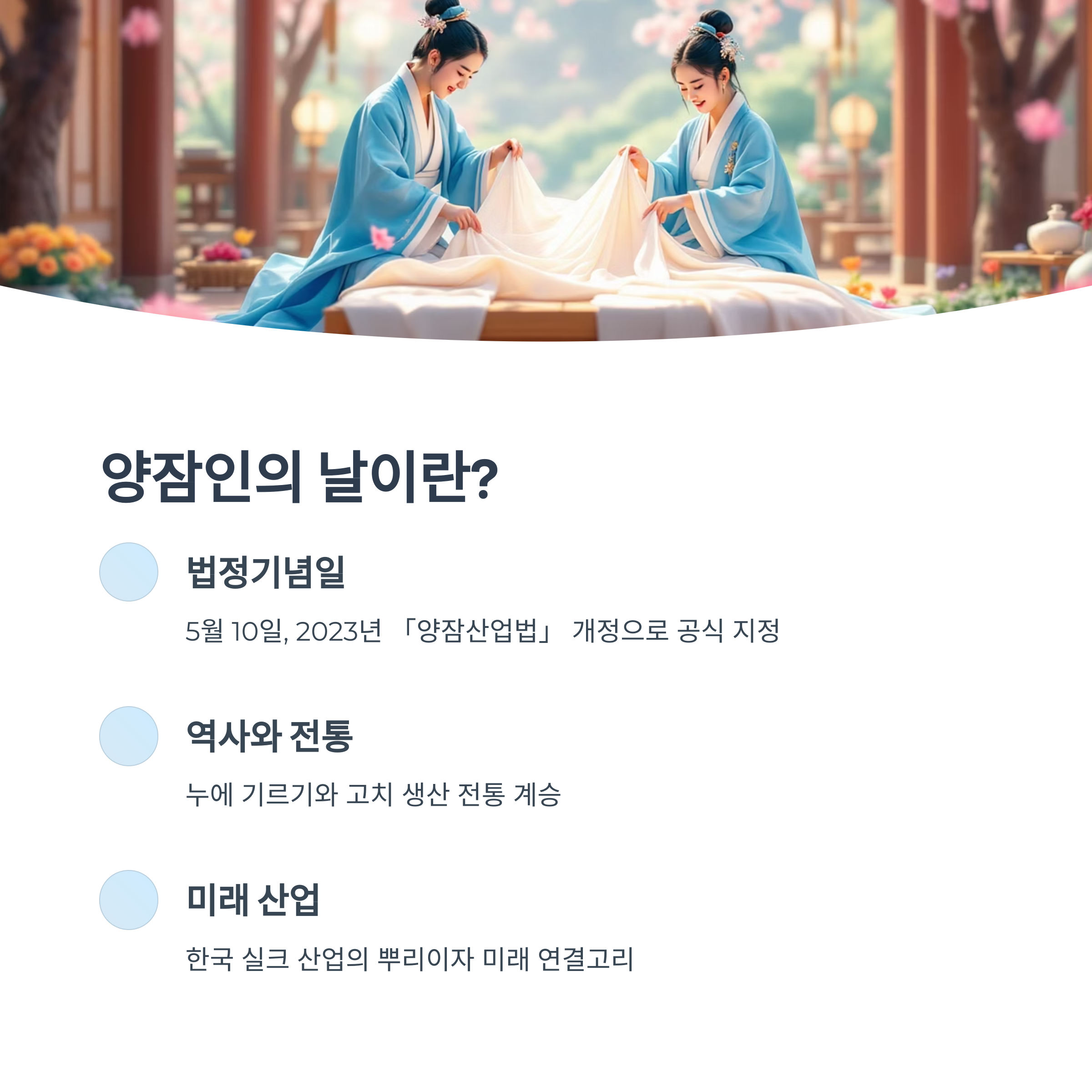 양잠인의 날은 5월 10일에 개최되는 법정기념일로, 누에를 기르고 고치를 생산하는 양잠업의 역사와 전통을 계승하고, 현대 산업으로의 전환과 발전을 함께 기념하기 위해 제정되었습니다. 이는 단순한 농업 축제가 아닌, 한국 실크 산업의 뿌리이자 미래 산업으로의 연결고리를 다지는 문화적 행사입니다.