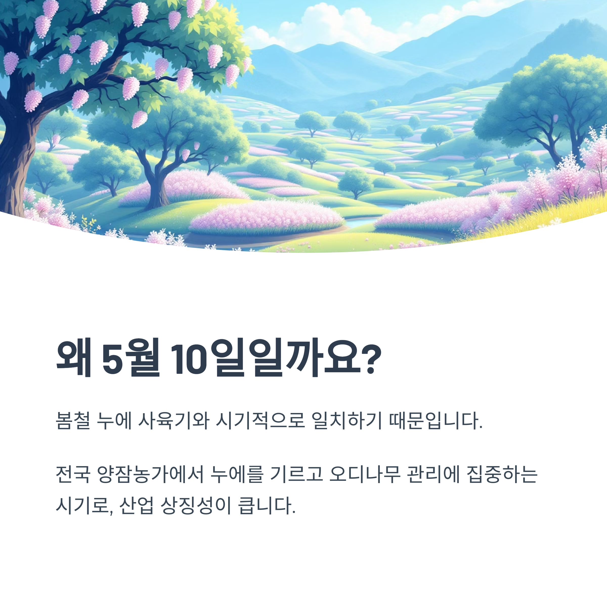 양잠인의 날이 5월 10일로 지정된 이유는 양잠이 본격적으로 시작되는 봄철 누에 사육기와 시기적으로 일치하기 때문입니다. 이 시기는 전국 양잠농가에서 누에를 기르고, 오디나무 관리에 집중하는 시기이기에 산업 상징성이 크며, 계절과 문화가 만나는 최적의 타이밍으로 평가받습니다.