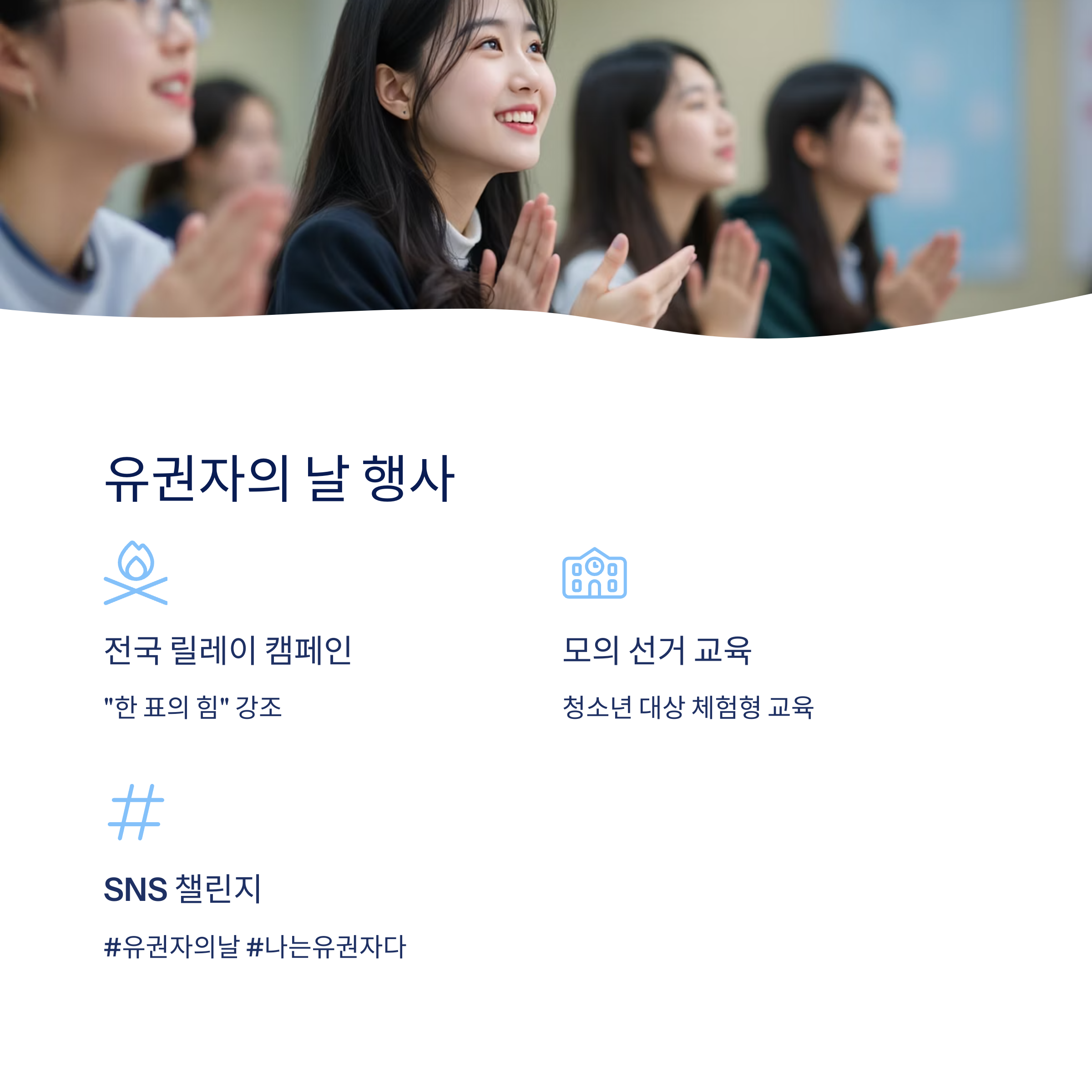 중앙선거관리위원회 주관으로 전국 캠페인, 모의선거 교육, 온라인 챌린지, 유권자 선언문 낭독, 정책 세미나 등이 개최됩니다.