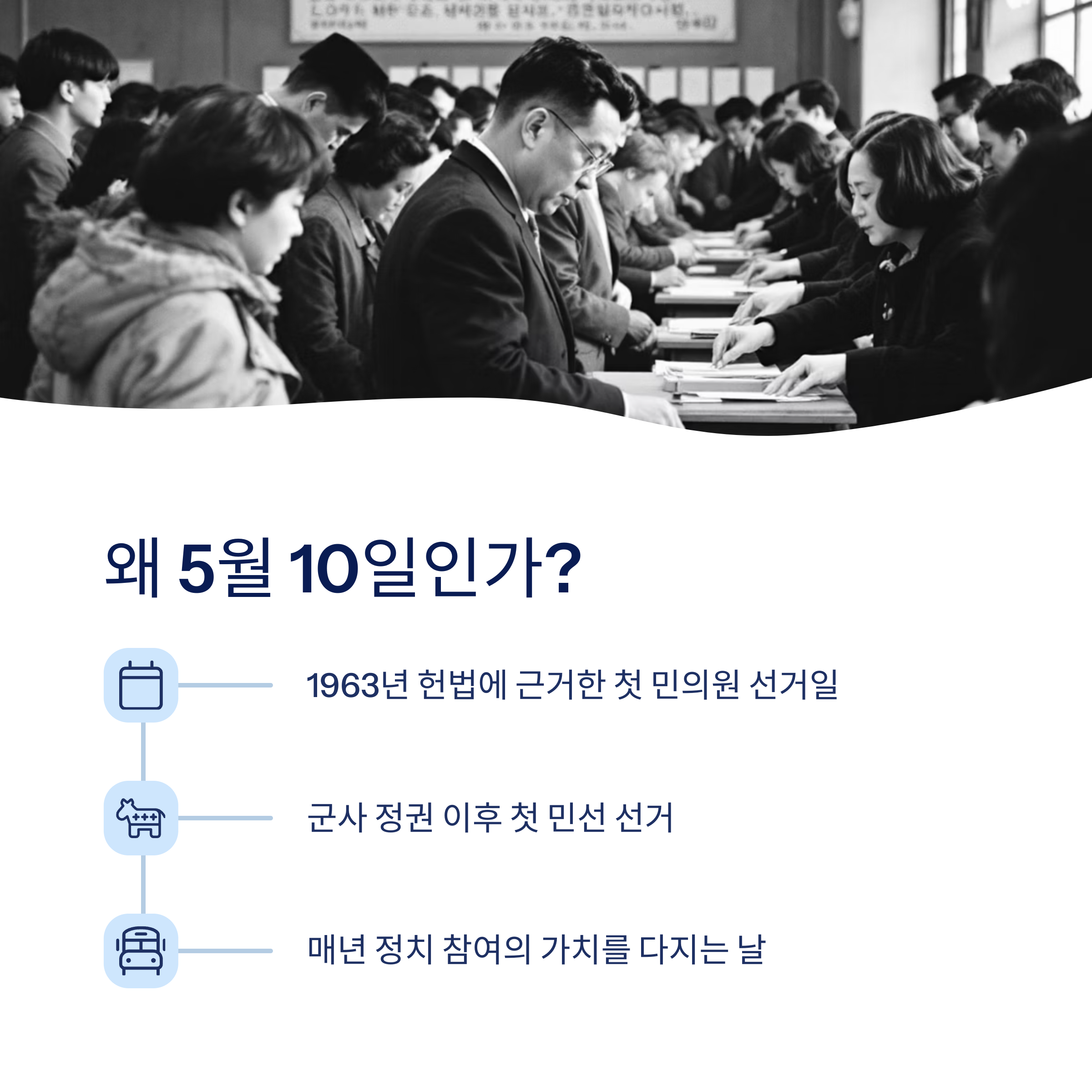 5월 10일은 단순한 역사적 기념일이 아니라, 매년 정치 참여의 가치를 새롭게 다지는 날이 되는 것입니다.