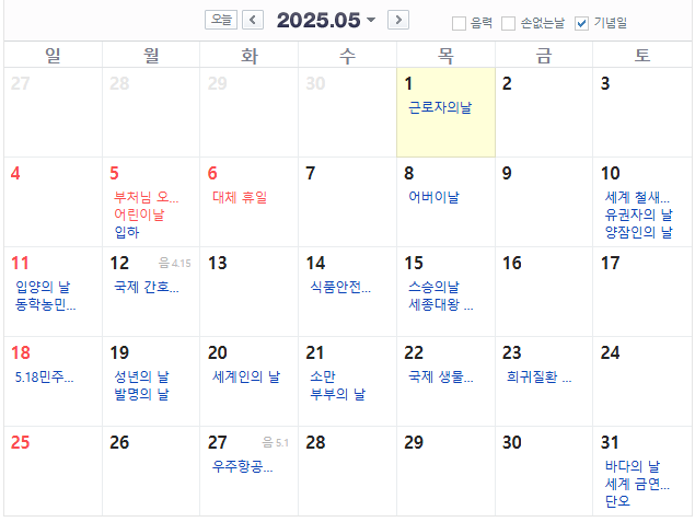 2025년 5월 달력을 보면 다음과 같은 일정이 있습니다.