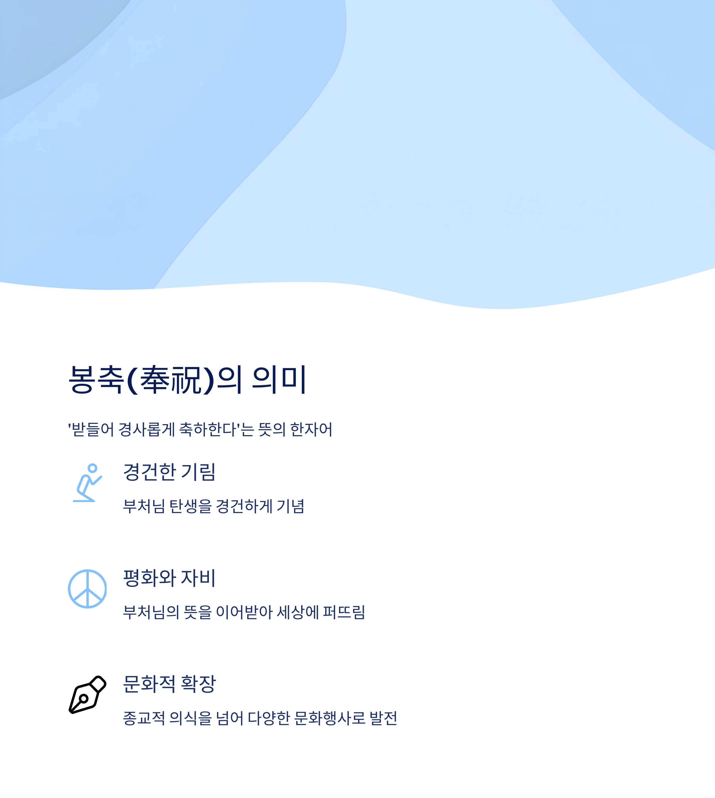 봉축은 '받들어 경사롭게 축하한다'는 의미로, 부처님의 탄생을 경건히 기리고 축하하는 것을 말합니다.