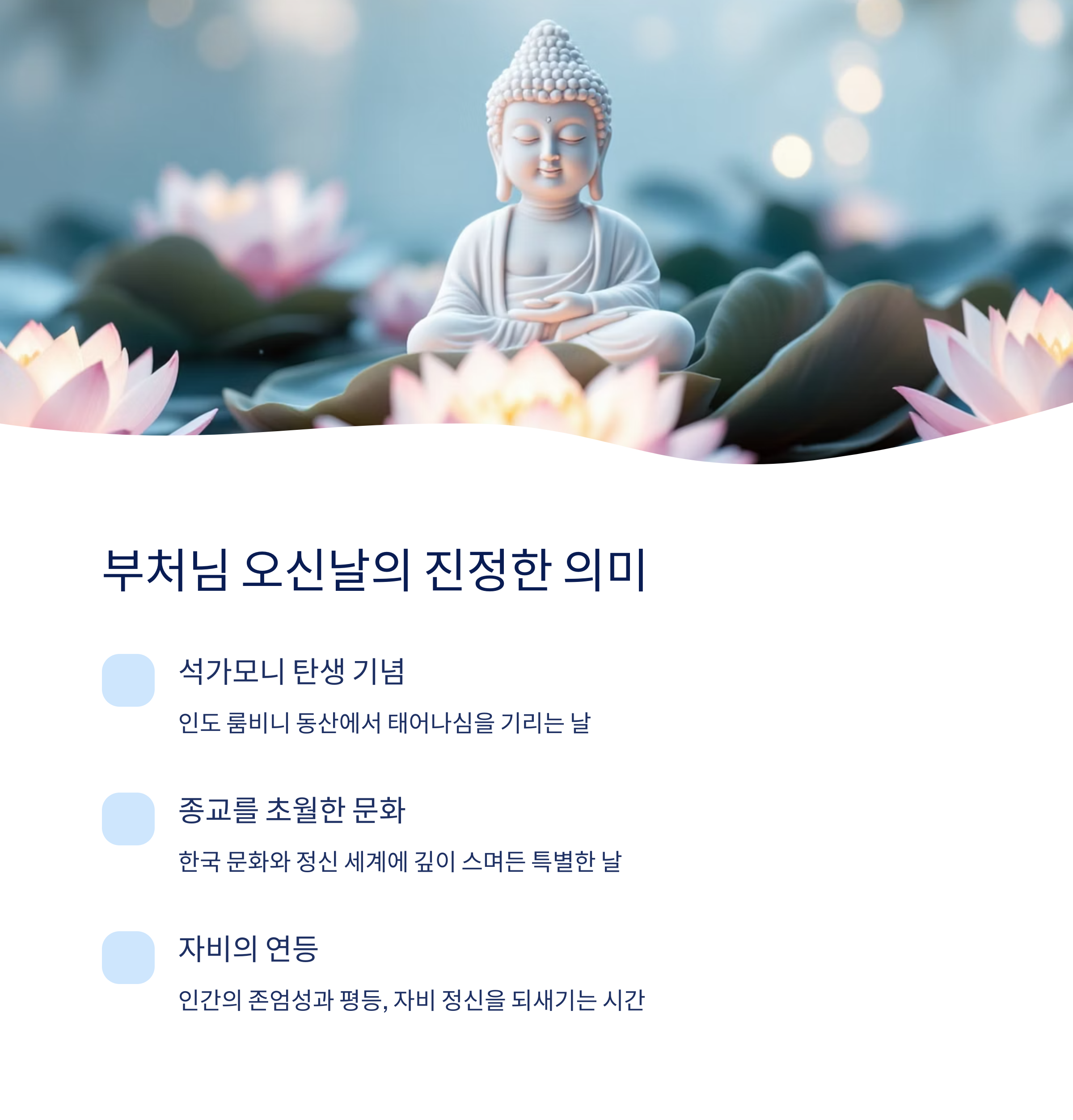 부처님 오신날은 단순히 탄생을 기리는 것을 넘어, 인간의 존엄성과 평등, 자비의 정신을 다시 한 번 되새기는 날입니다. 이 날은 각자의 마음속에 '자비'라는 연등을 밝히는 과정이라 할 수 있습니다.
