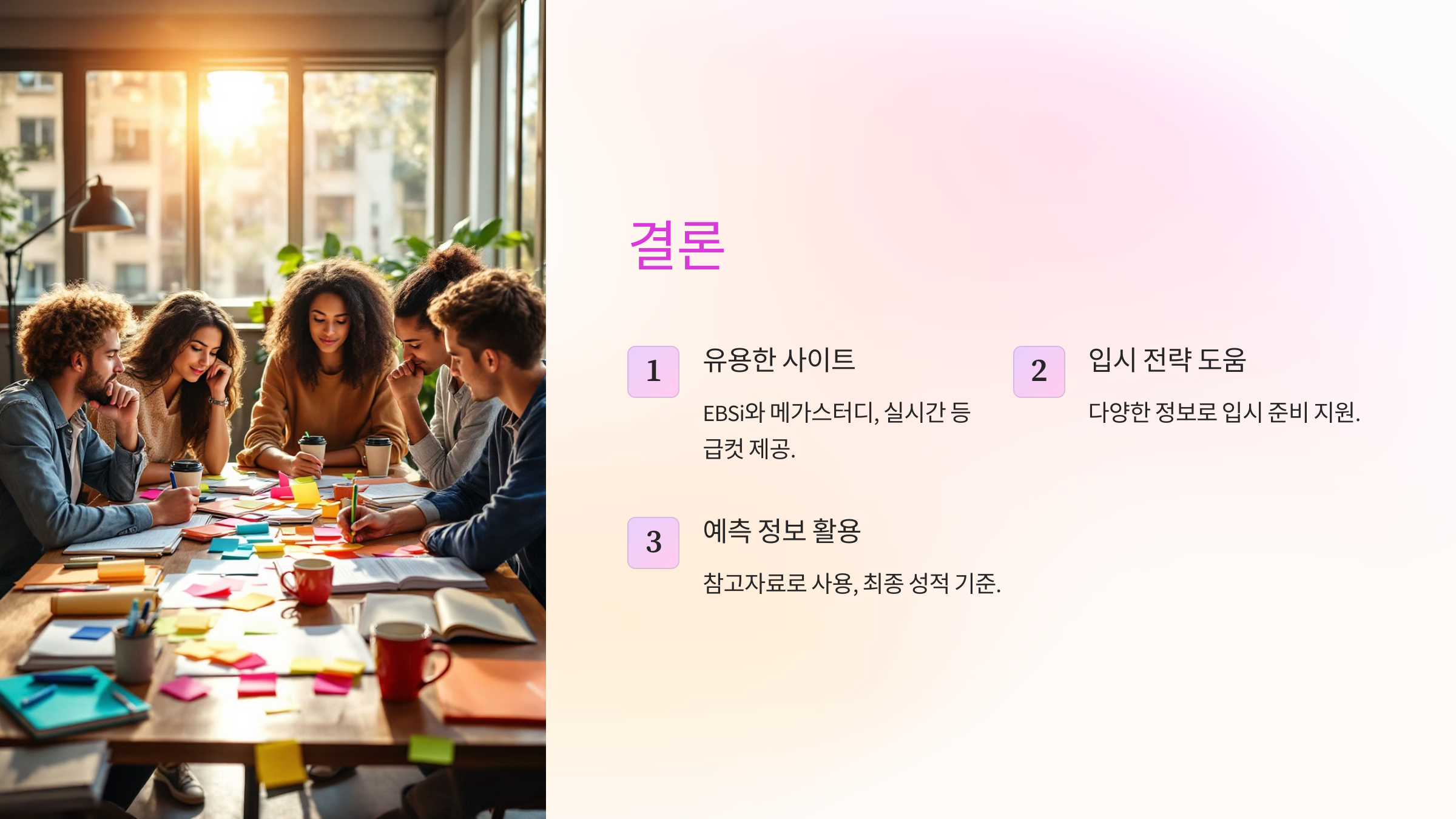 2025학년도 수능을 본 수험생들에게 EBSi와 메가스터디는 실시간으로 등급컷을 확인할 수 있는 유용한 사이트입니다. 이 두 플랫폼은 실시간 등급컷뿐 아니라 입시 전략에 필요한 다양한 정보를 제공하므로, 수험생들이 적극 활용해 입시 준비에 큰 도움을 받을 수 있습니다. 하지만, 예측 정보는 참고자료로만 활용하고 최종 성적 발표 후 확정된 등급컷을 기준으로 지원 계획을 세우는 것이 중요합니다.