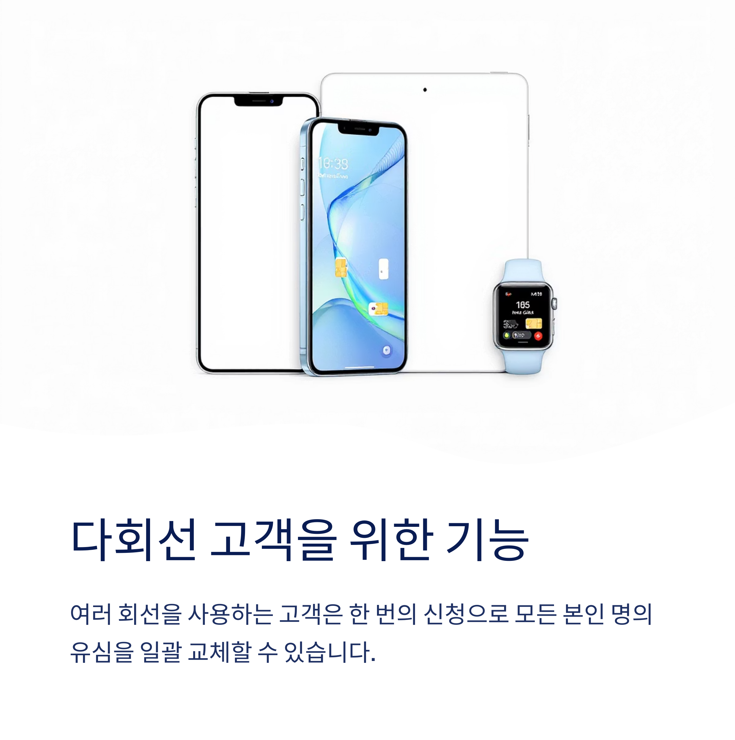 여러 개 회선을 사용하는 고객(스마트폰, 태블릿, 워치 등)은 한 번의 신청으로 모든 본인 명의 유심을 일괄 교체 신청할 수 있습니다. 이는 특히 기업 고객이나 가족 단위 고객들에게 매우 유용한 기능입니다.
