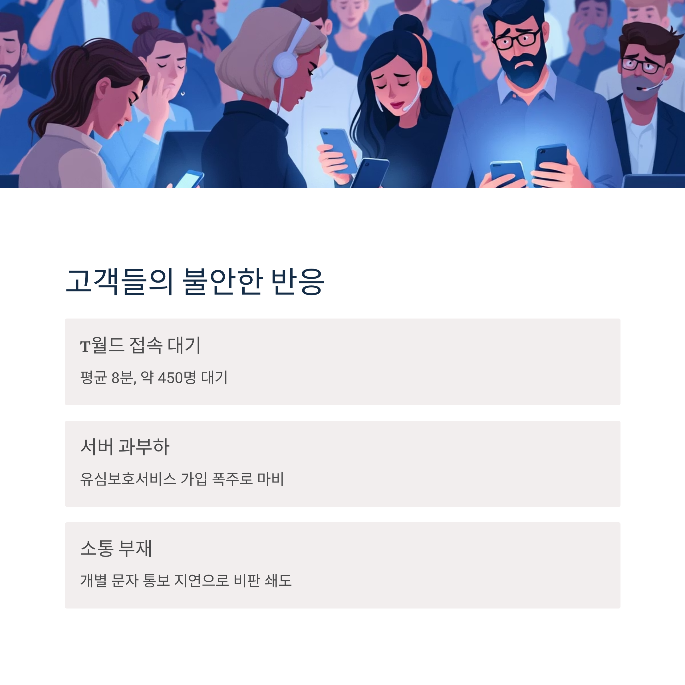지난 4월 19일, SK텔레콤이 대규모 해킹 공격을 받으면서 수많은 이용자가 정보 유출 위험에 불안감을 느끼고 있습니다. 이로 인해 유심보호서비스 가입이 폭주하며 T월드 고객센터 서버가 과부하 상태에 이르렀습니다.