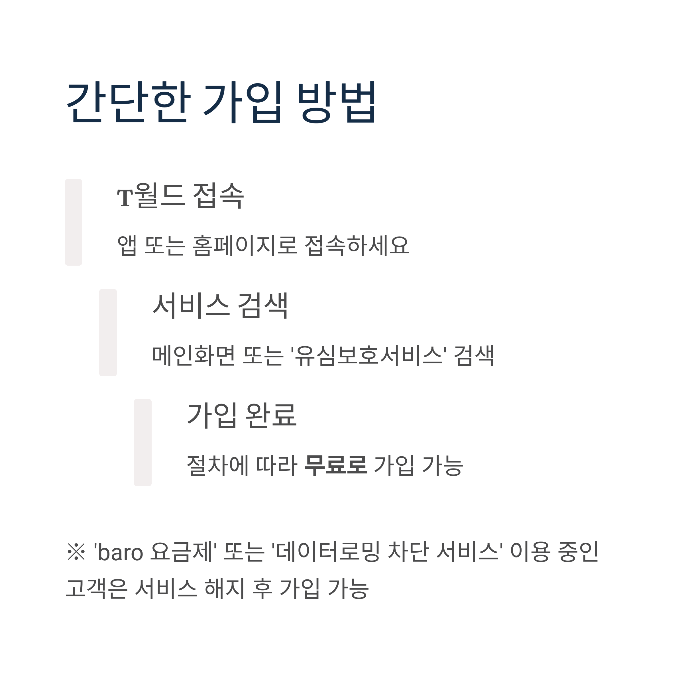 지금 이 순간에도 여러분의 정보를 지키기 위한 첫걸음은 바로 유심보호서비스 가입입니다. 무료, 간단, 즉시 적용 가능한 이 기능을 꼭 활용해보세요.